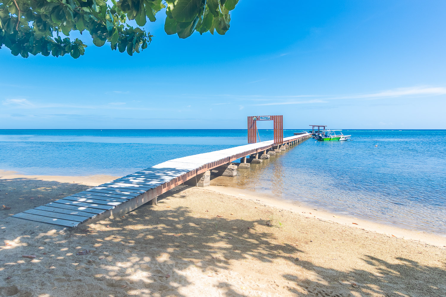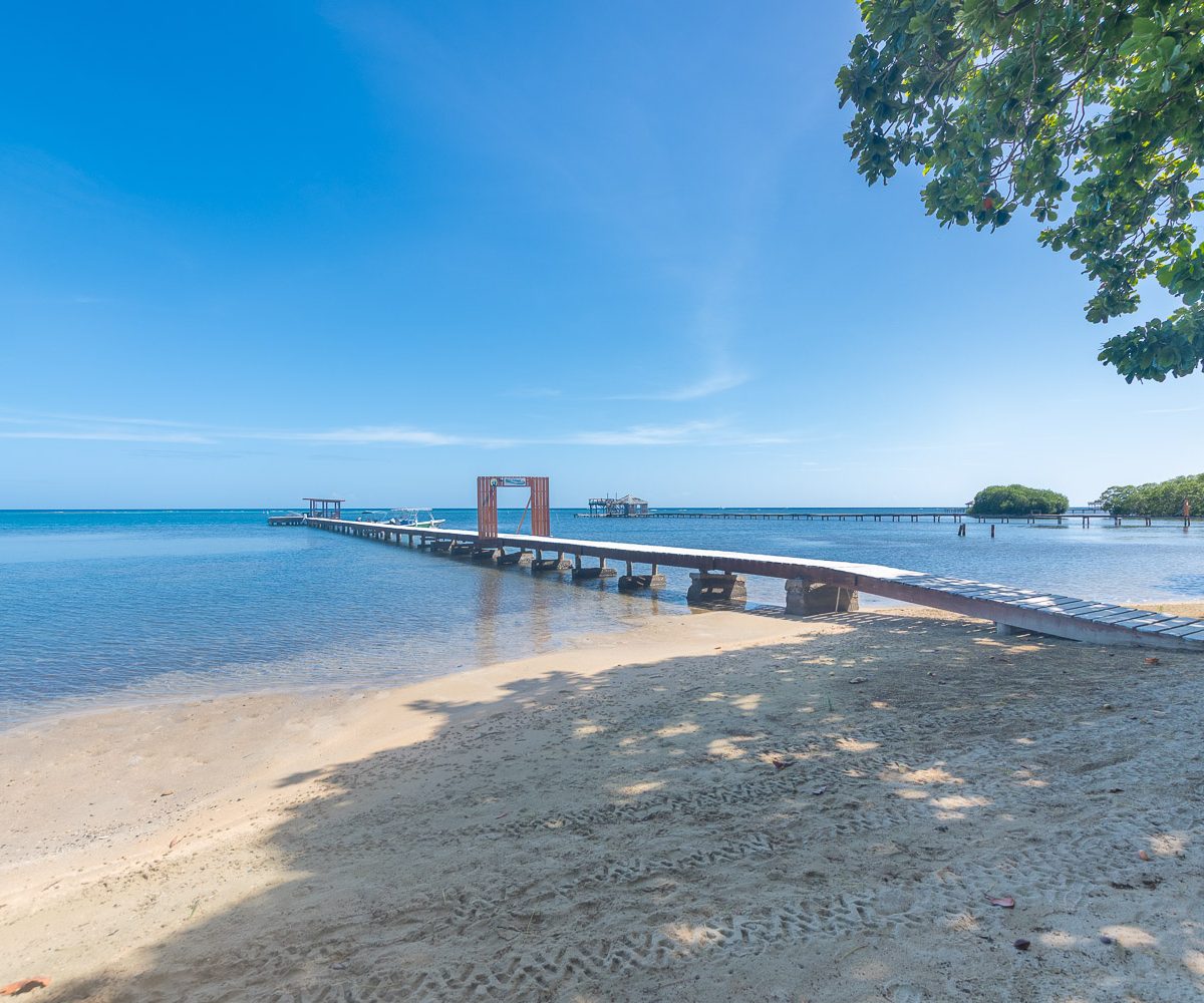 A 300-foot pier, built in 2021 with new pilings, substructure, and decking, extends out to a 900 sq. ft. dock platform, all coated with a white elastomeric surface for sun protection and durability. At the entrance of the premises sits an open-air beachfront restaurant facility, currently under lease. The restaurant includes a bodega, kitchen, bar, restrooms, and a boardwalk to beach access.